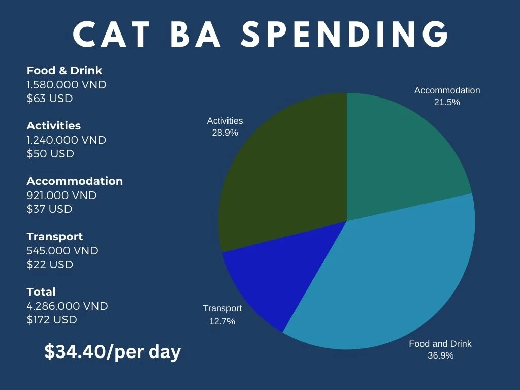 Isabelle and I keep track of all our spending and total costs for the week in Cat Ba. Cat Ba was one of the most budget-friendly areas we stayed in. The graph below shows all of our spending over our 5 days there!