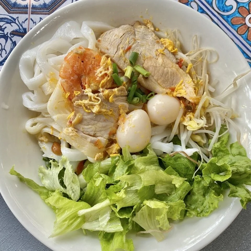 Quang noodles are made with a bone and fish sauce broth, and topped with pork, hard-boiled quail eggs, greens, and a few other ingredients to make a delicious noodle bowl. It is not served with a lot of broth, and you have to mix it very well to combine all the flavors. These can be found worldwide but originate from the Quang Nam Province (hence the name).