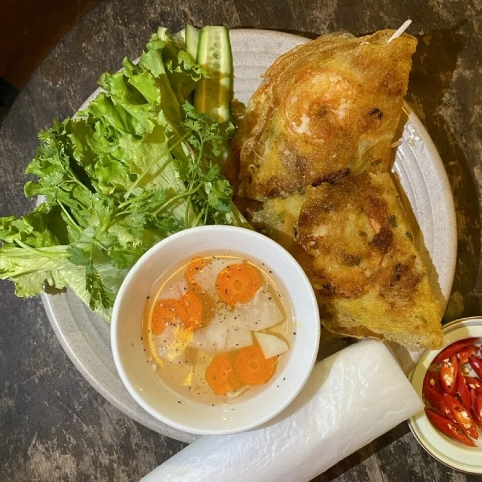 Meat (usually pork), shrimp, sprouts, and herbs are all loaded into a crispy shell and fried to make a rice pancake. Many places will fold it and make it look like a taco. These can be found all over town at food stalls, or restaurants. At restaurants, they will be served with rice paper and fresh toppings, so you can roll into a spring roll. We found that the best ones were served in restaurants - unlike Bahn Mi's which were perfectly delicious in stalls.