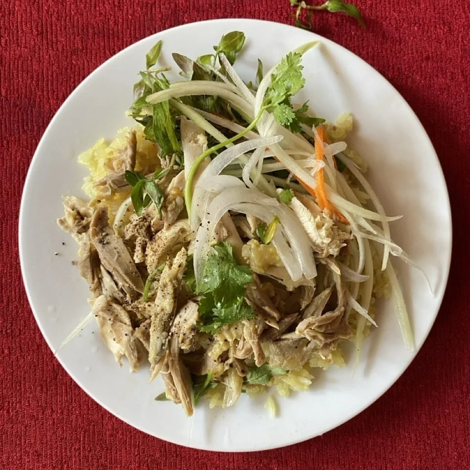 A plate of golden rice served with shredded chicken and fresh herbs. You will also get a bowl of soup to go with your meal. This dish is simple but delicious. I don't think any place can claim to have created Chicken Rice, but Hoi An has done a fantastic job using their local herbs to create a simple, yet tasteful plate of chicken and rice.