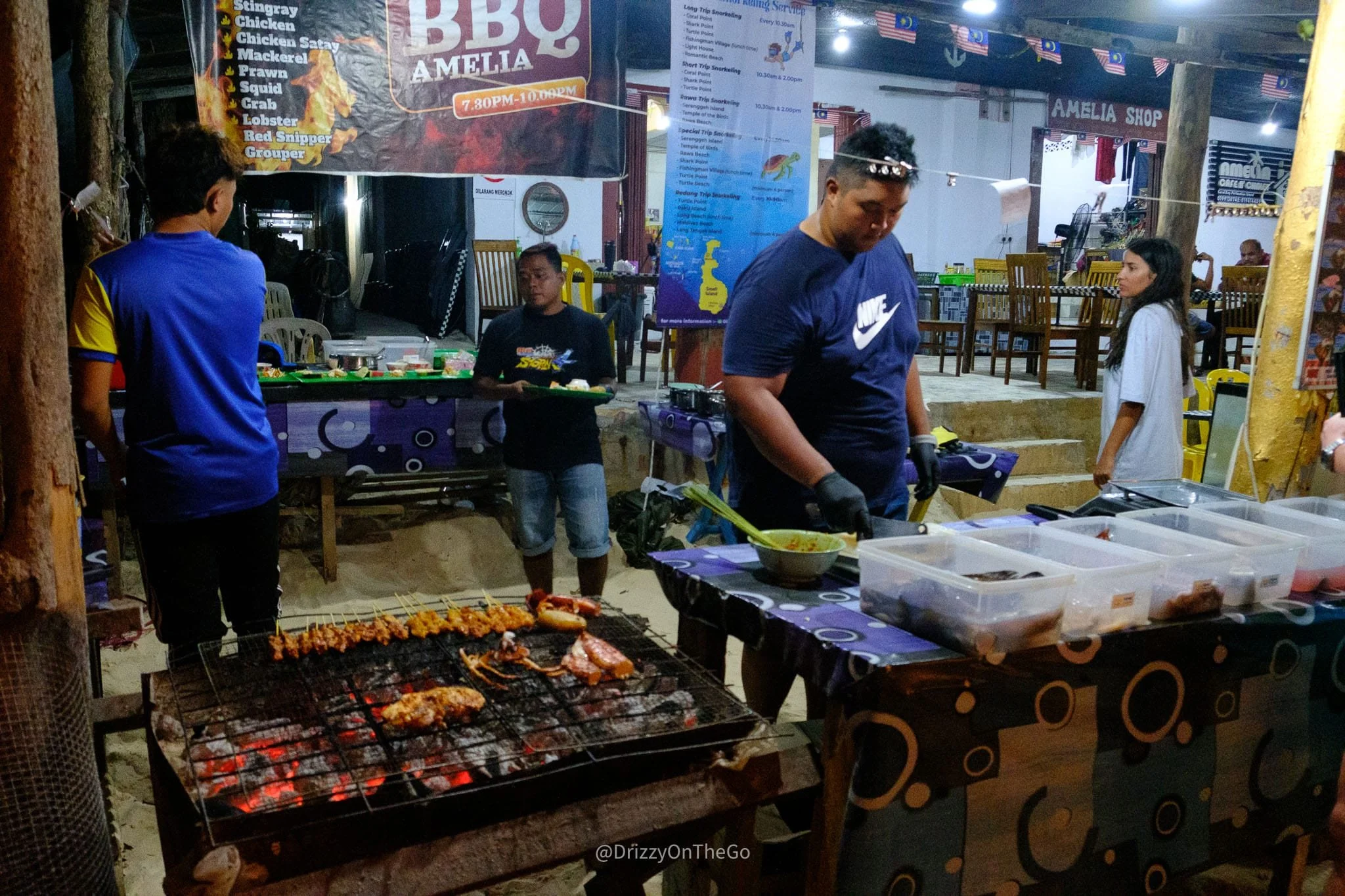 Amelia's is open for breakfast, lunch, and dinner. In the evenings, they have a giant BBQ where you choose from local catch-of-the-day. Starting at 25 MYR ($5), you’ll get a plate of freshly caught fish with rice, sauce, and a salad. You can expect to choose from these options: squid, barracuda, dorado, prawns, and on some days, there might even be a special catch available! Since they're grilling it fresh, you'll most likely wait 20-30 minutes, so enjoy a beer in the meantime.