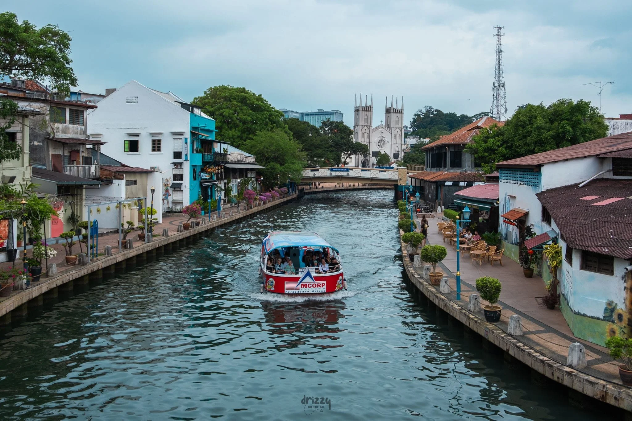 Riverboat cruise on the Malacca's canal, Church of Saint Francis stands in the background